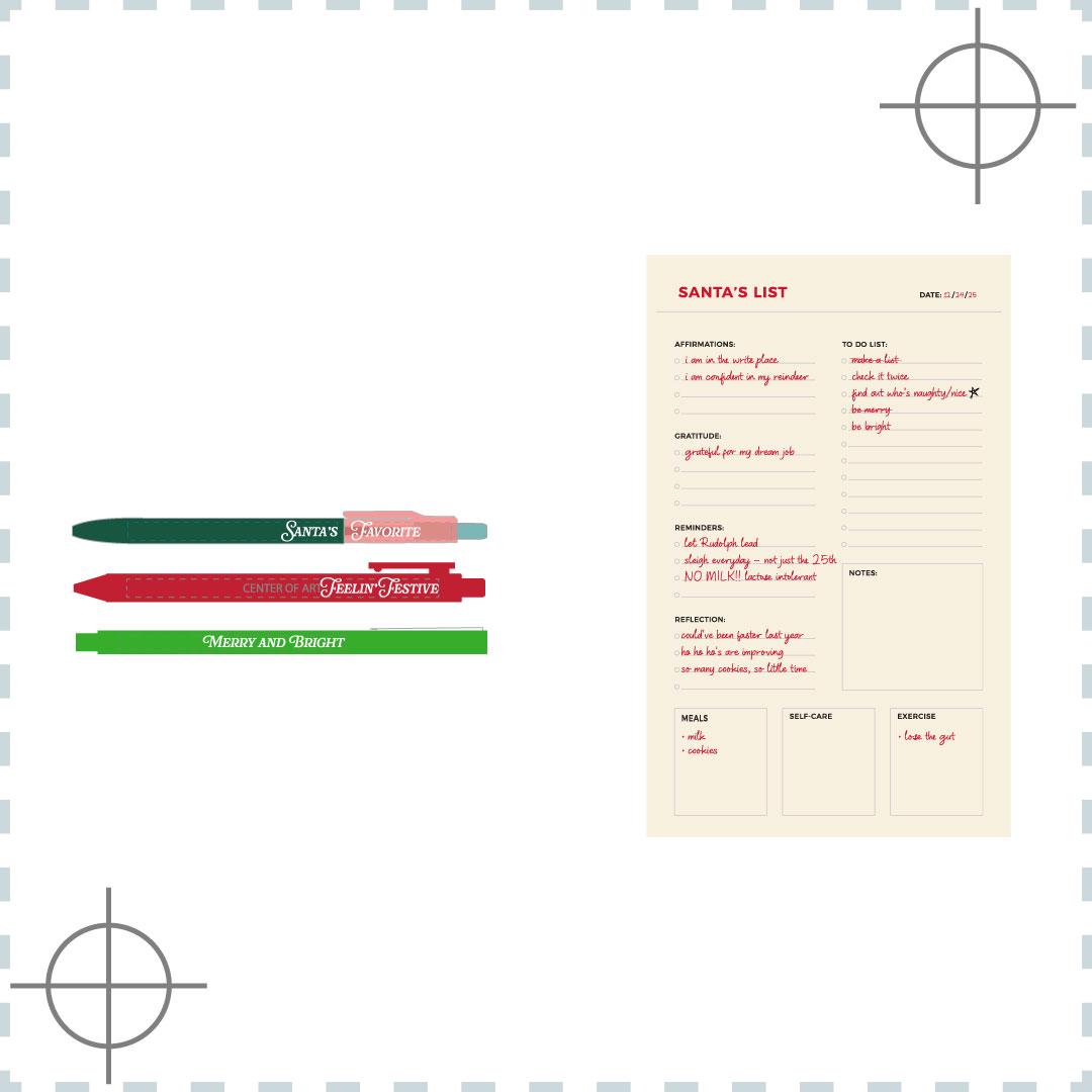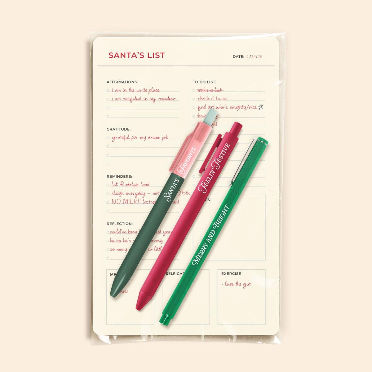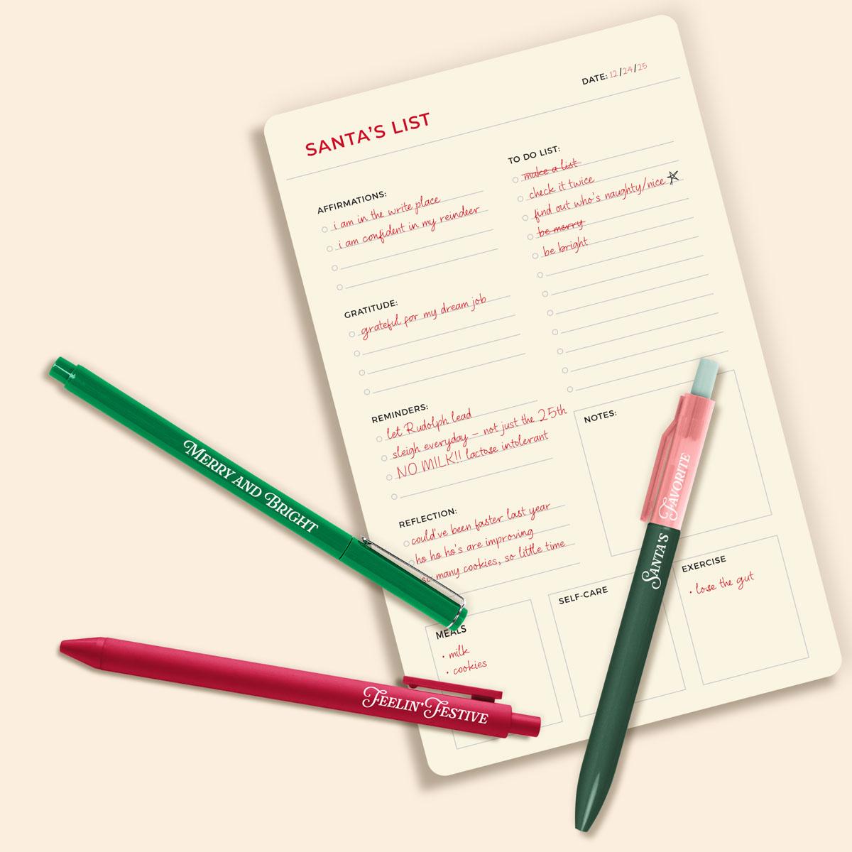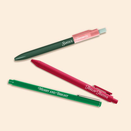 All they want for Christmas? The perfect mix of pens. This seasonal novelty mailer delivers three writing instruments on a Santa's list–themed insert card: one 3-Way ballpoint pen for click-and-switch fun, one smooth Jotter pen, and one sleek Le Pen. Packaged together in a clear poly bag, it’s a ready-to-mail set that covers every style of writing- whether they’re signing, doodling, or jotting down wish lists.